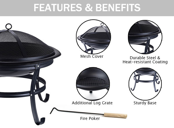 This portable outdoor campfire fire pit from Sarchi is made of high-quality steel for durability. With a sleek black finish and sturdy legs, it adds a rustic yet modern touch to your patio decor. The powder coating is rust- and weather-resistant, ensuring durability throughout the seasons. The matching poker and spark screen make fire-making safe and enjoyable. The poker helps you move logs easily, while the spark screen prevents sparks from flying, making your outdoor gatherings safe and worry-free. It perfectly balances style and function, enhancing the ambiance of your outdoor space.