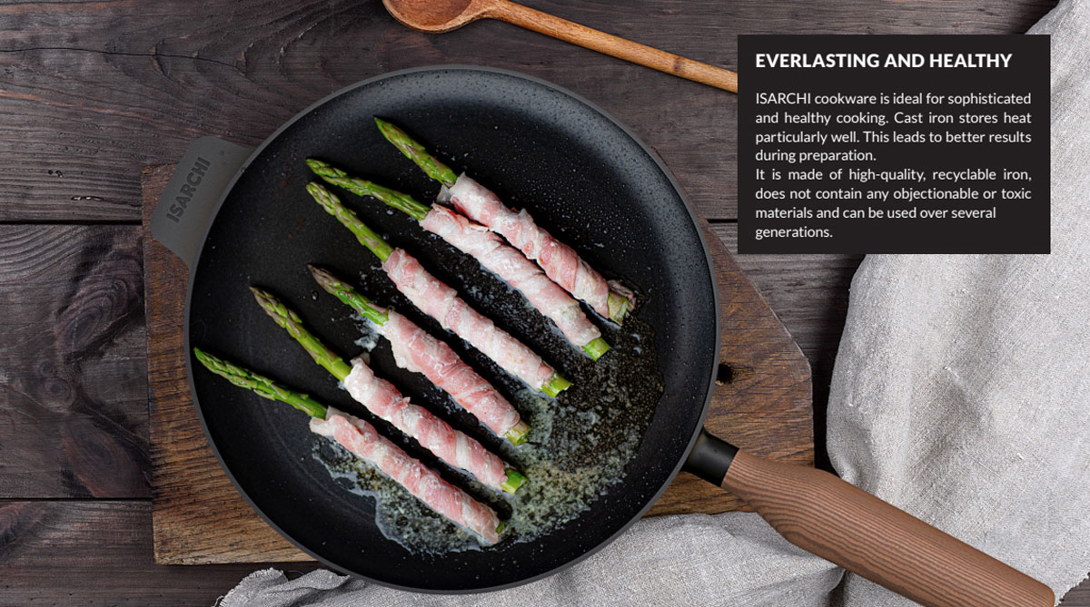 ISARCHI cookware is ideal for sophisticated and healthy cooking. Cast iron stores heat particularly well. This leads to better results during preparation. It is made of high-quality, recyclable iron, does not contain any objectionable or toxic materials, and can be used over several generations.