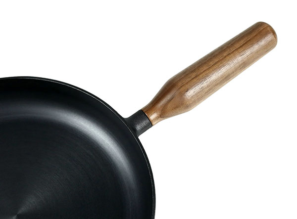 The handles flow smoothly into the walls. The wooden pan handle insulates the heat and its large profile provides a secure hold without pressure points and sharp edges.