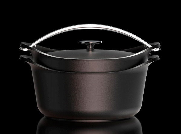 Sarchi cookware set was specifically created for use on open fires or barbecues. The fire pot and pan are made from 100% cast iron – a material that distributes the heat of the open fire evenly and allows for both slow cooking and rapid searing of food. A newly developed droplet structure on the inside of the lid improves the cooking results by distributing condensate evenly over the food. The stainless steel handles are easy to attach, allowing the pots to be placed directly on the fire and subsequently stored without occupying much space.