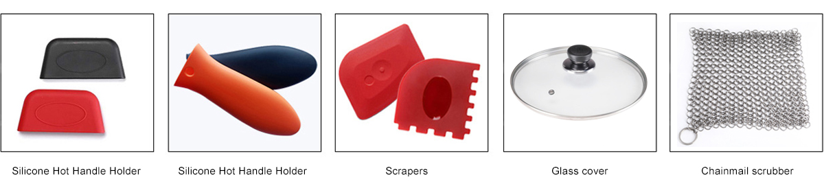 Accessories can also be added to our 12 inch cast iron skillet, including silicone hot handle holders, chainmail scrubber, scrapers, etc. If you have special needs, please let us know and we will do our best to realize it for you. In addition to the following accessories, we can also provide matching glass covers, as long as you have requirements.