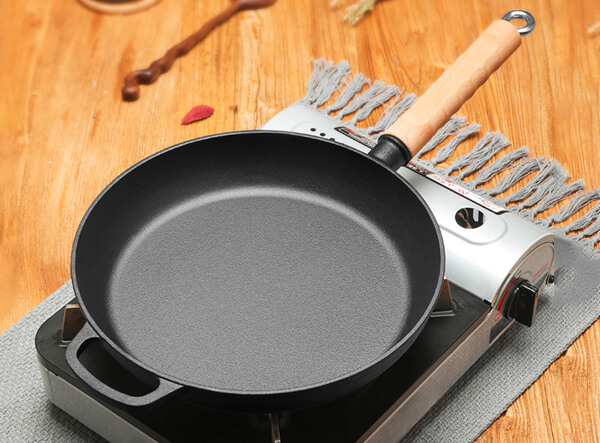 -The cast iron skillet with a wooden handle has a large cooking surface, heats evenly, and can maintain and distribute heat evenly and effectively. The smooth base is compatible with all cooktops, including induction cookers.